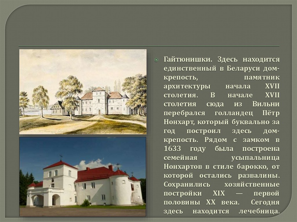 Гайтюнишки. Здесь находитсяединственный в Беларуси домкрепость,