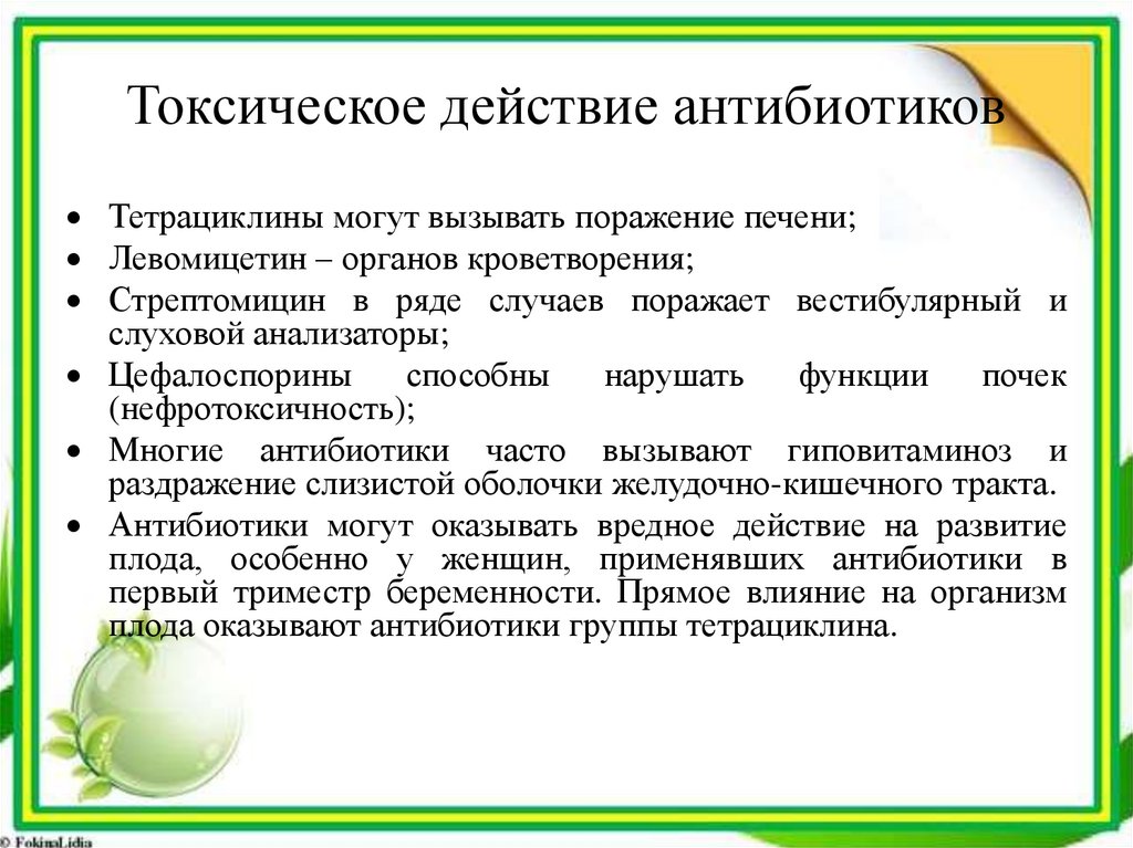 Токсическое действие антибиотиковТетрациклины могут вызывать поражение печени;