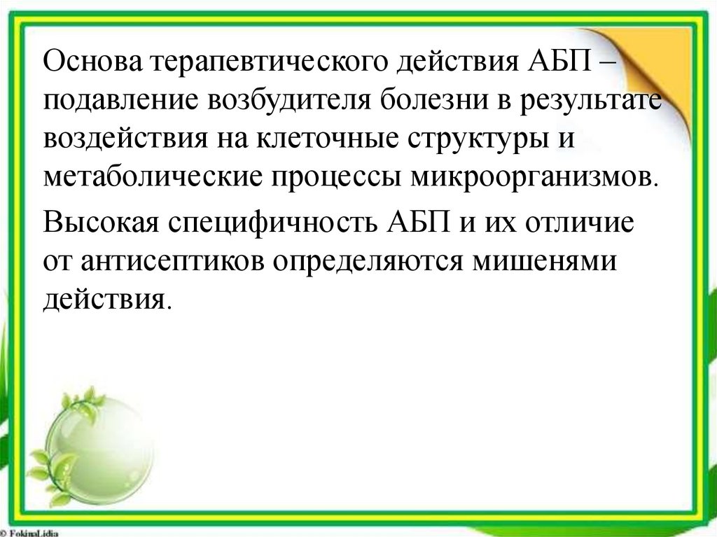 Основа терапевтического действия АБП –подавление возбудителя болезни в результате