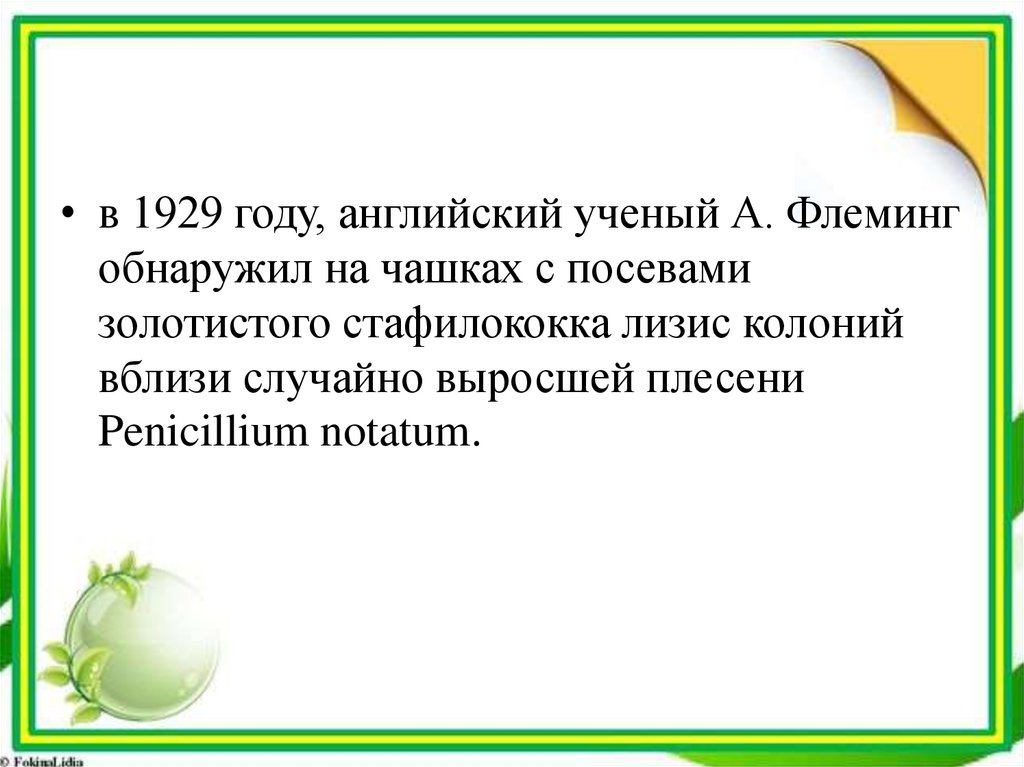 • в 1929 году, английский ученый А. Флемингобнаружил на чашках с посевами