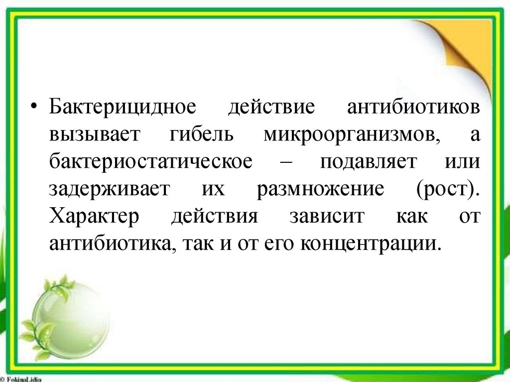 • Бактерицидное действие антибиотиковвызывает гибель микроорганизмов, а