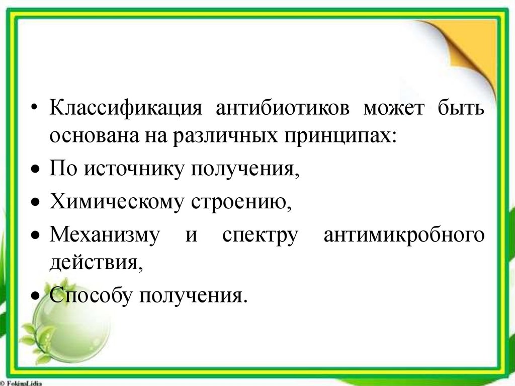 • Классификация антибиотиков может бытьоснована на различных принципах: