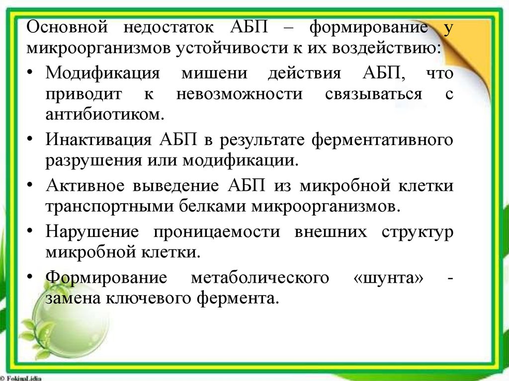 Основной недостаток АБП – формирование умикроорганизмов устойчивости к их воздействию: