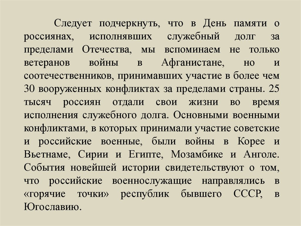 Следует подчеркнуть, что в День памяти ороссиянах, исполнявших служебный долг за