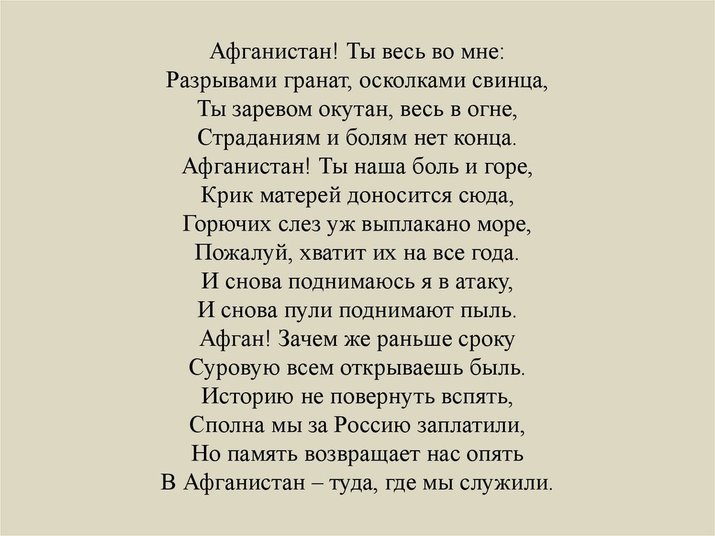 Афганистан! Ты весь во мне:Разрывами гранат, осколками свинца,
