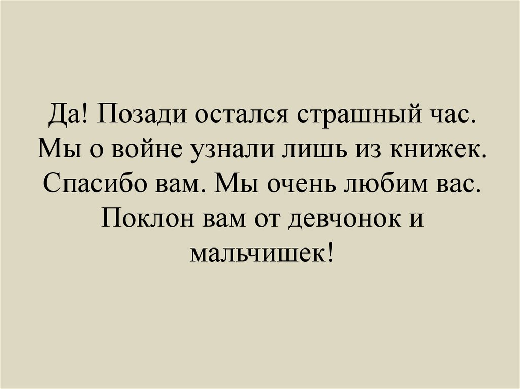 Да! Позади остался страшный час.Мы о войне узнали лишь из книжек.