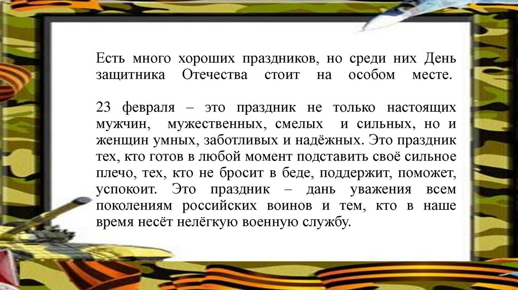 Есть много хороших праздников, но среди них Деньзащитника Отечества стоит на особом месте.