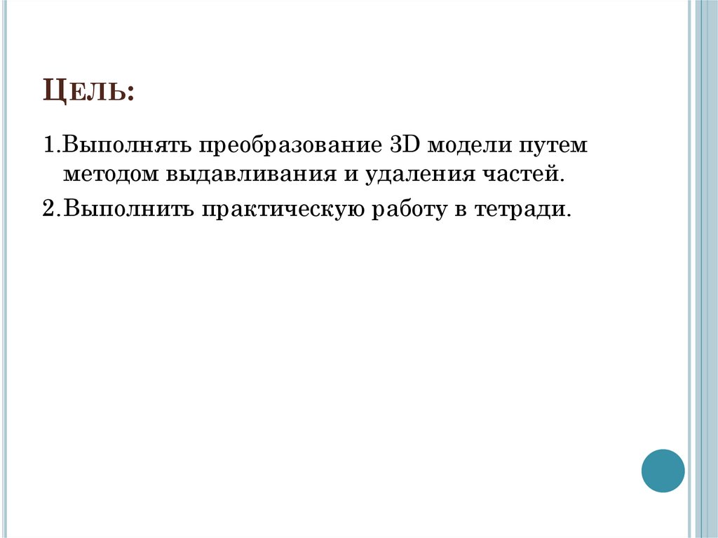 ЦЕЛЬ:1.Выполнять преобразование 3D модели путем