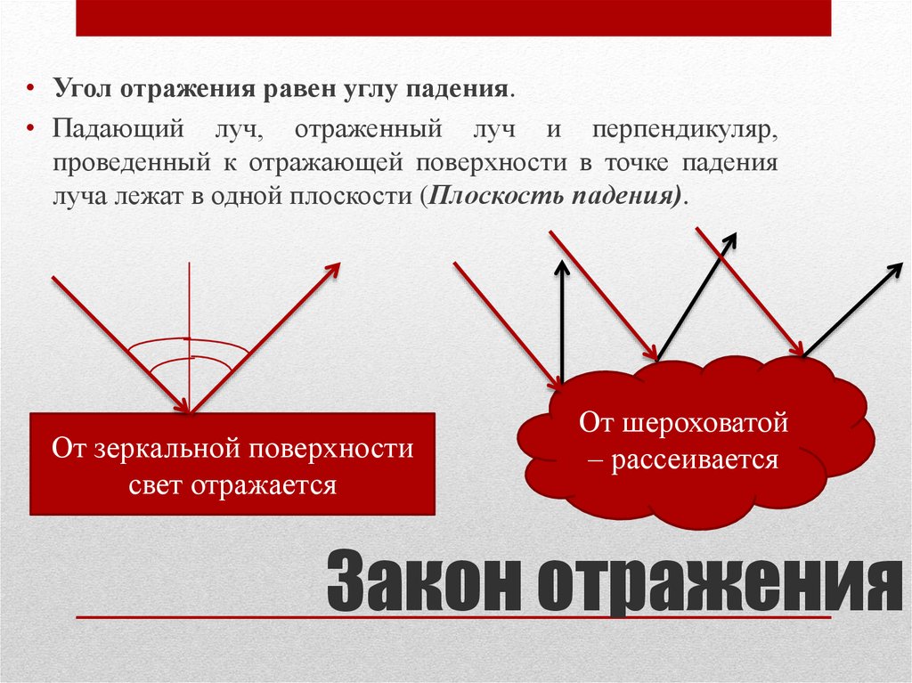 • Угол отражения равен углу падения.• Падающий луч, отраженный луч и перпендикуляр,