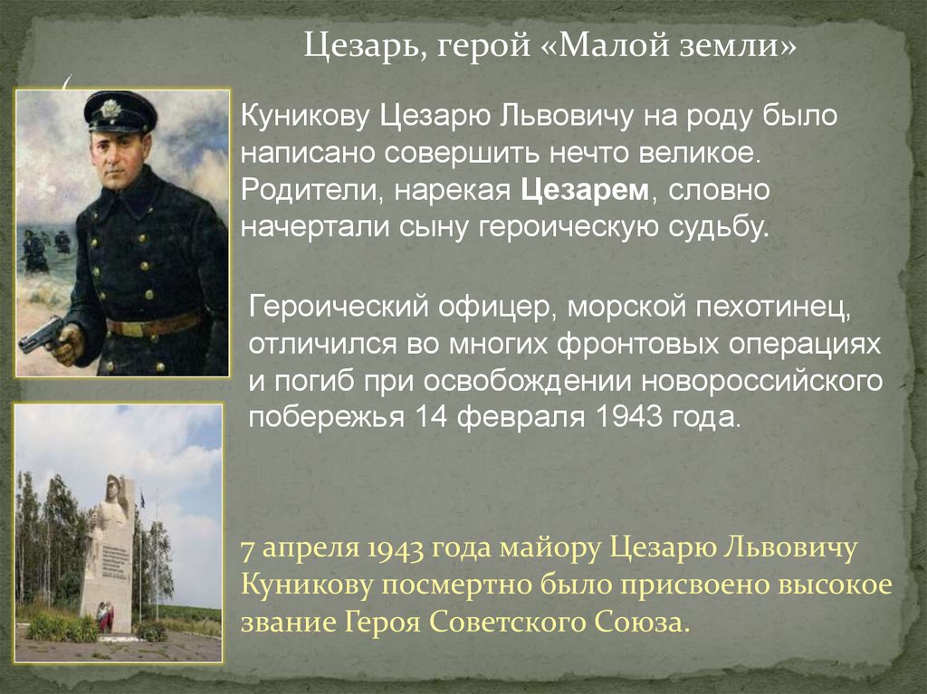 Цезарь, герой «Малой земли»Куникову Цезарю Львовичу на роду было