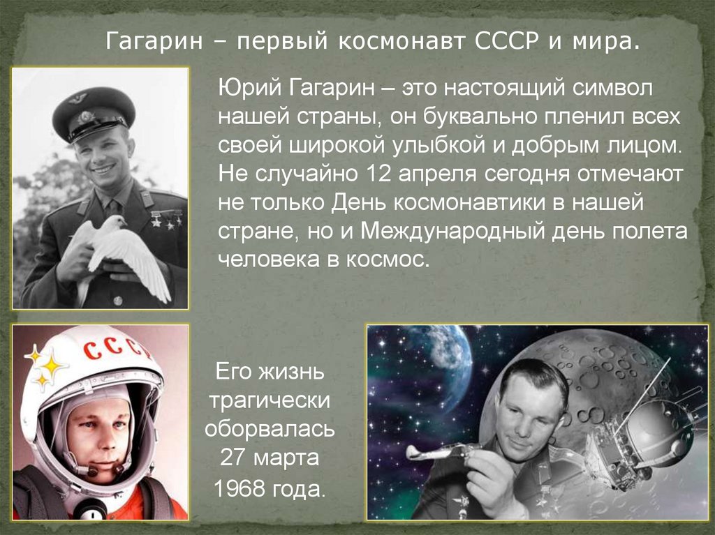 Гагарин – первый космонавт СССР и мира.Юрий Гагарин – это настоящий символ