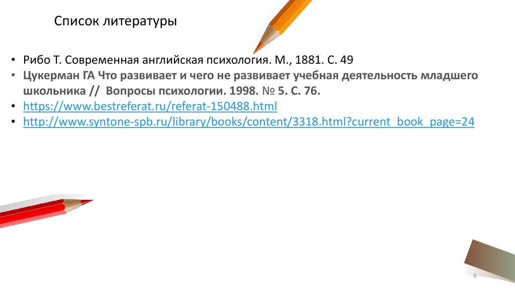 Список литературы• Рибо Т. Современная английская психология. М., 1881. С. 49