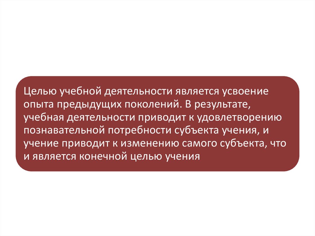 Целью учебной деятельности является усвоениеопыта предыдущих поколений. В результате,