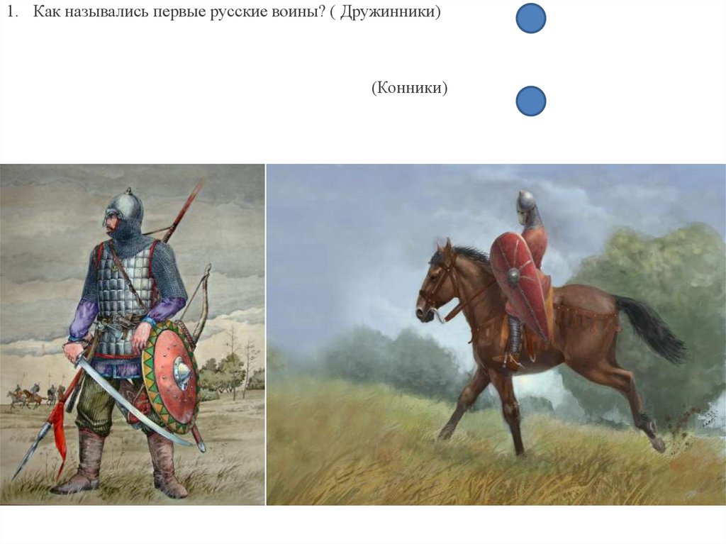 1. Как назывались первые русские воины? ( Дружинники)(Конники)