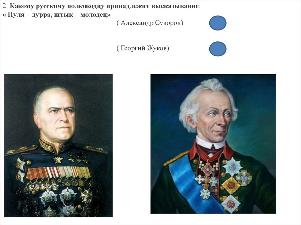 2. Какому русскому полководцу принадлежит высказывание:« Пуля – дурра, штык – молодец»