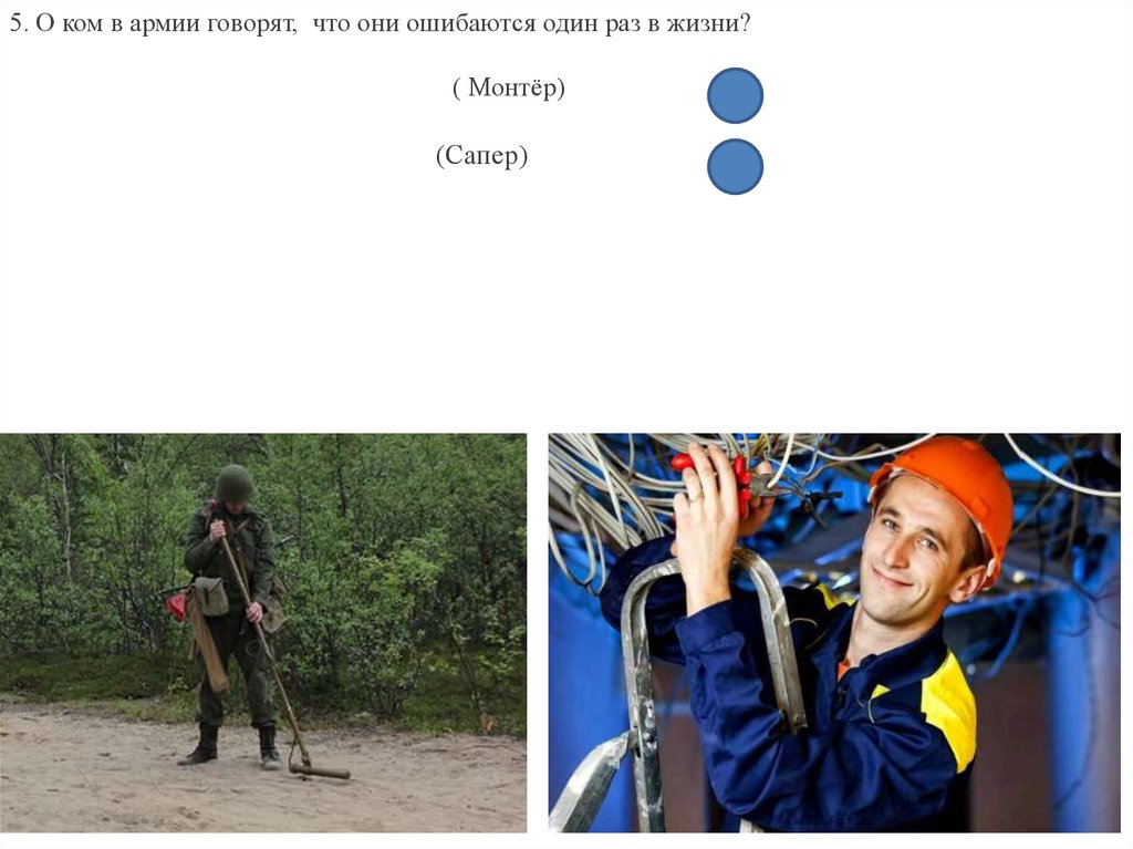 5. О ком в армии говорят, что они ошибаются один раз в жизни?( Монтёр)