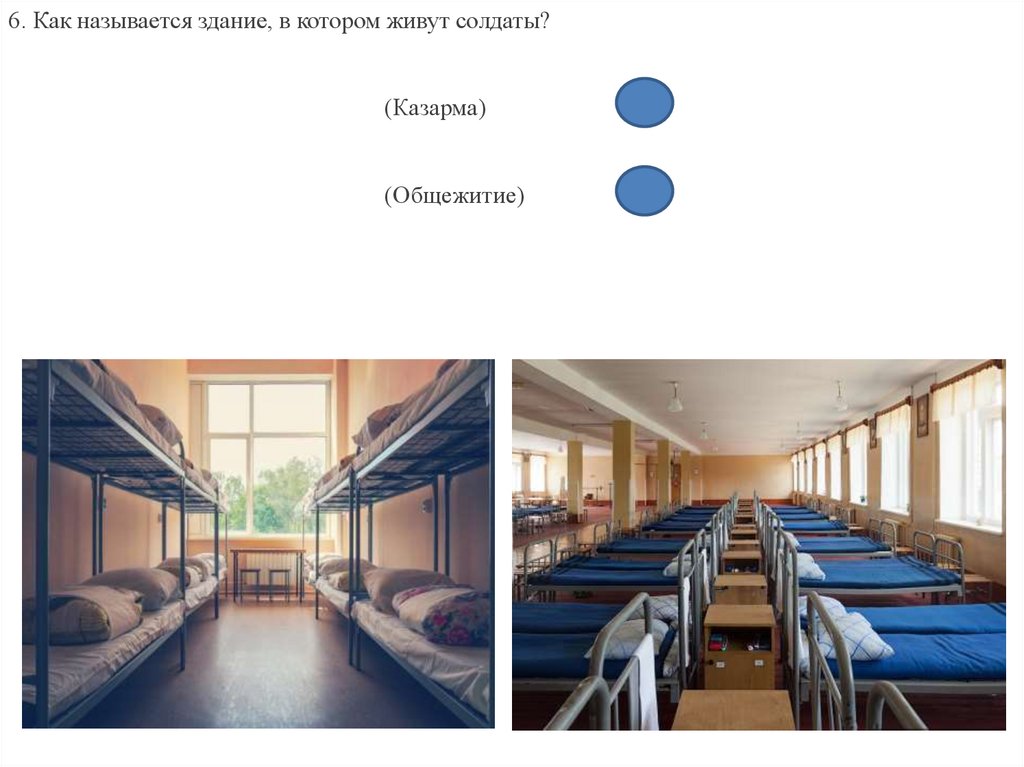 6. Как называется здание, в котором живут солдаты?(Казарма)