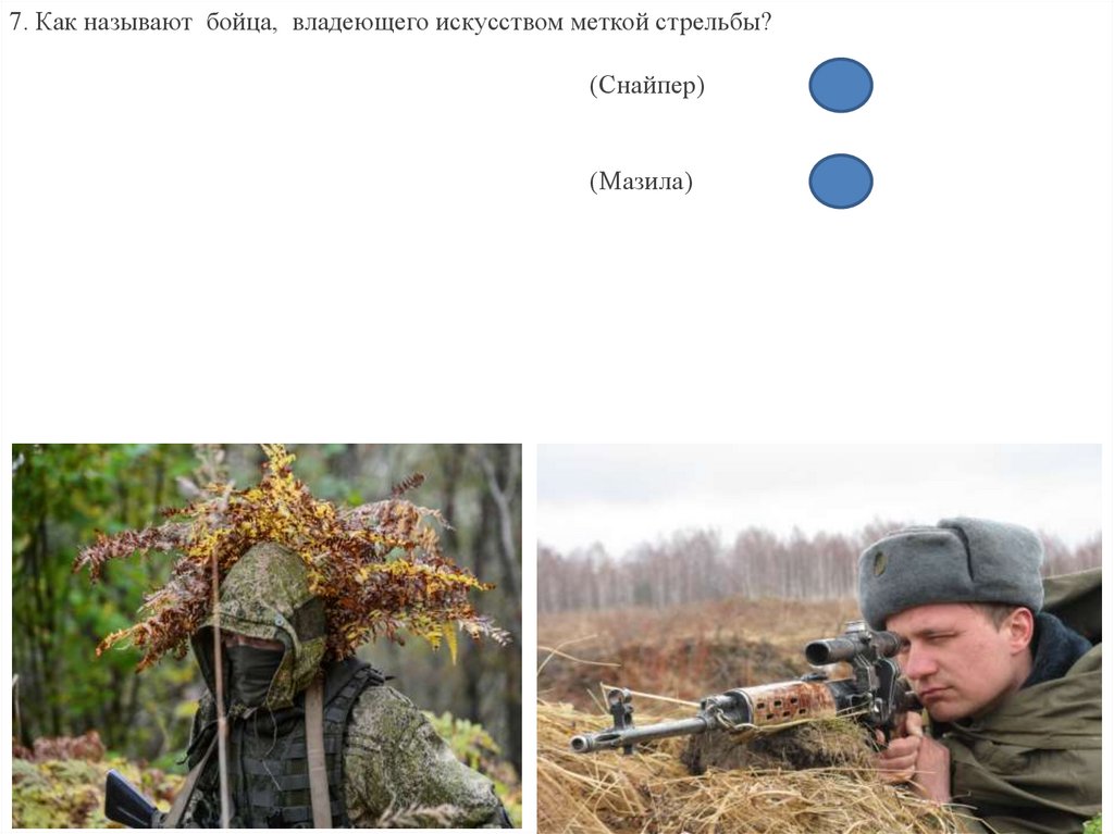 7. Как называют бойца, владеющего искусством меткой стрельбы?(Снайпер)