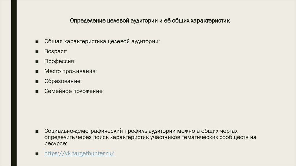 Определение целевой аудитории и её общих характеристик■ Общая характеристика целевой аудитории: