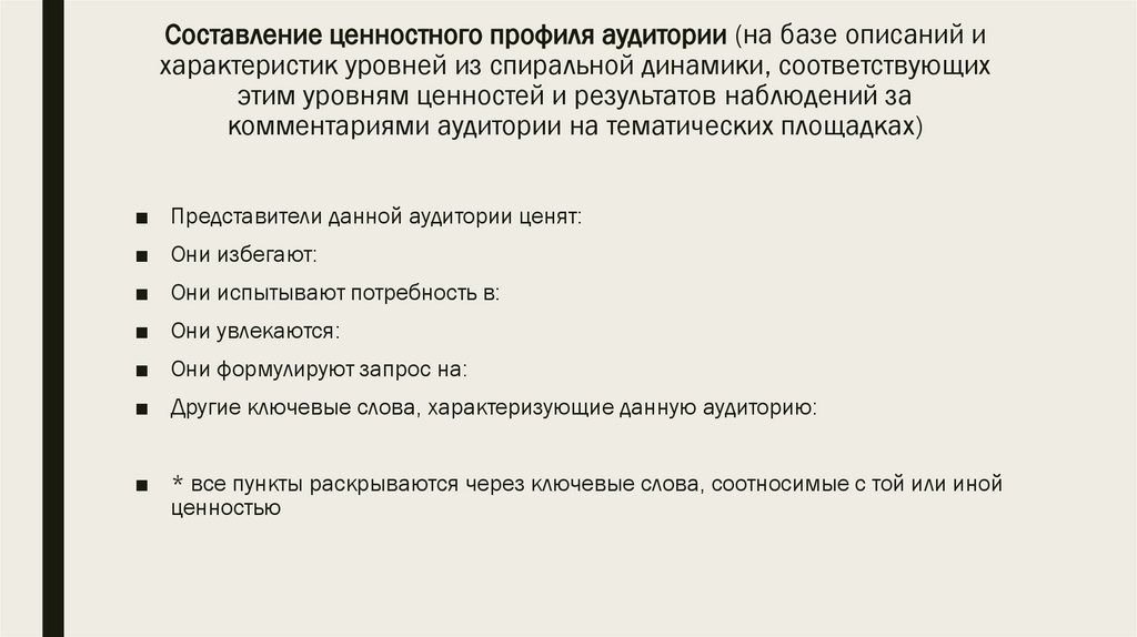 Составление ценностного профиля аудитории (на базе описаний ихарактеристик уровней из спиральной динамики, соответствующих