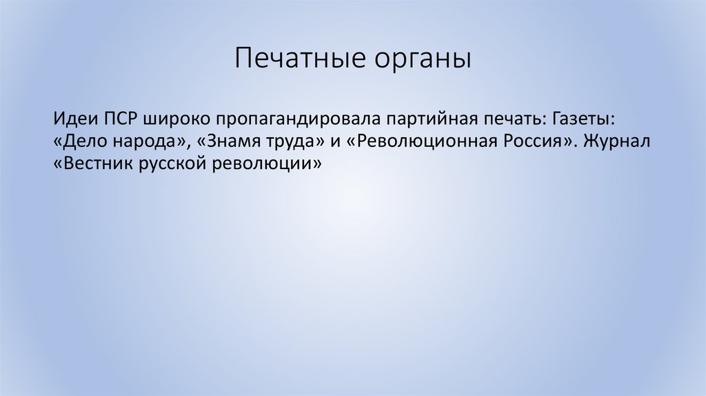 Печатные органыИдеи ПСР широко пропагандировала партийная печать: Газеты: