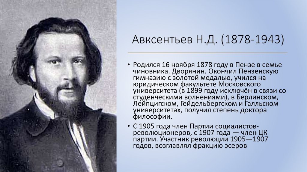 Авксентьев Н.Д. (1878-1943)• Родился 16 ноября 1878 году в Пензе в семье