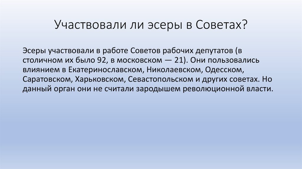 Участвовали ли эсеры в Советах?Эсеры участвовали в работе Советов рабочих депутатов (в