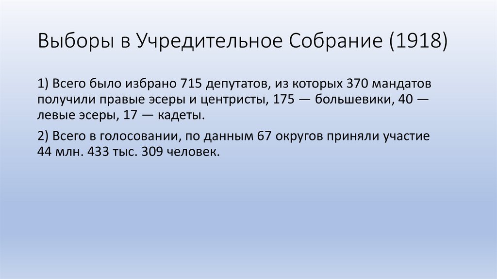 Выборы в Учредительное Собрание (1918)1) Всего было избрано 715 депутатов, из которых 370 мандатов