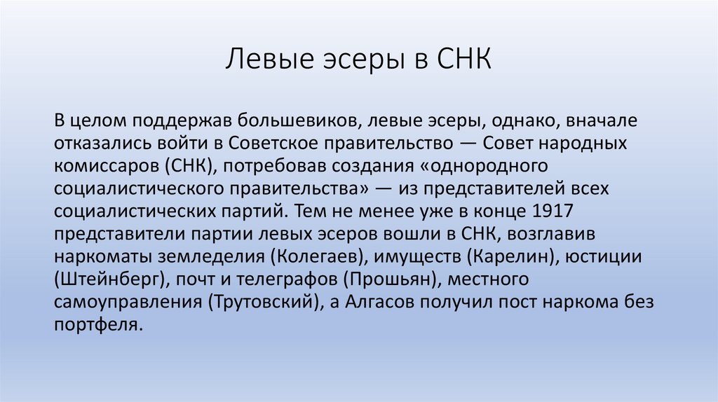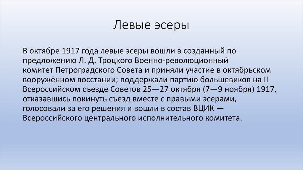 Левые эсерыВ октябре 1917 года левые эсеры вошли в созданный по