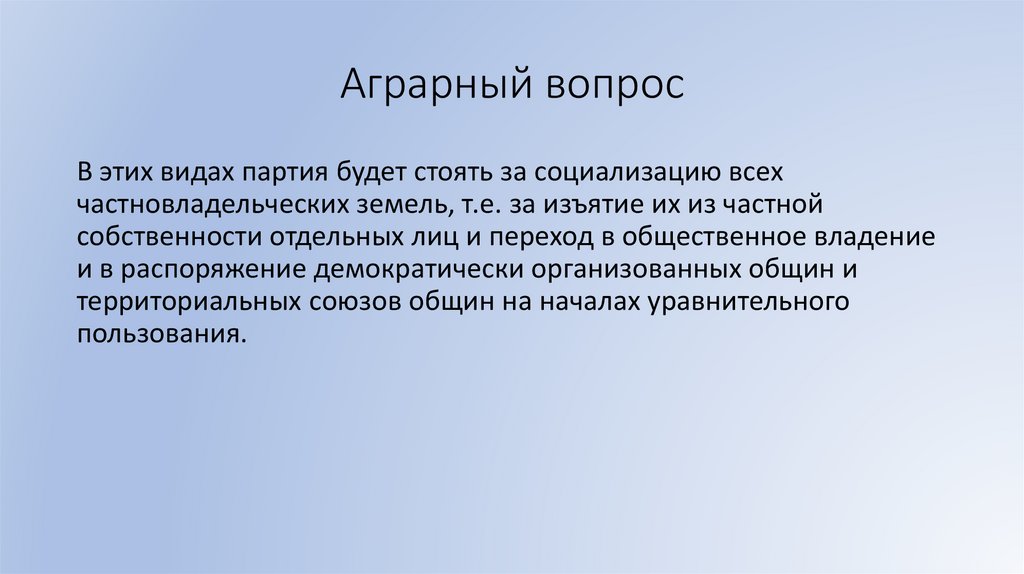 Аграрный вопросВ этих видах партия будет стоять за социализацию всех