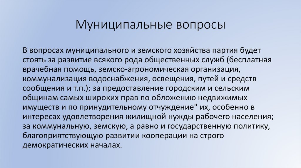 Муниципальные вопросыВ вопросах муниципального и земского хозяйства партия будет