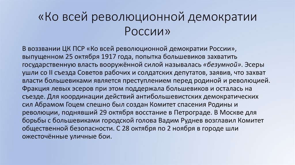 В воззвании ЦК ПСР «Ко всей революционной демократии России»,