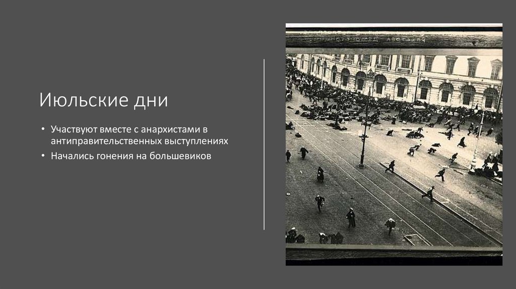 Июльские дни• Участвуют вместе с анархистами в
