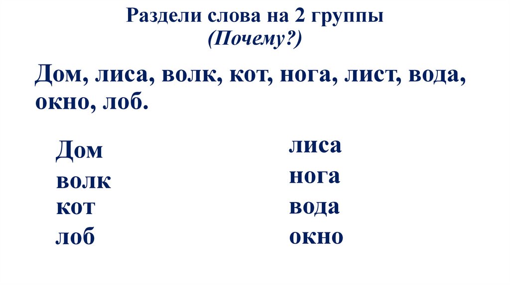 Раздели слова на 2 группы(Почему?)