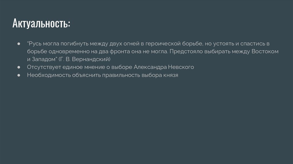 Актуальность:“Русь могла погибнуть между двух огней в героической борьбе, но устоять и спастись в