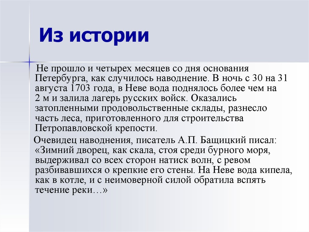 Очевидец наводнения, писатель А.П. Бащицкий писал: