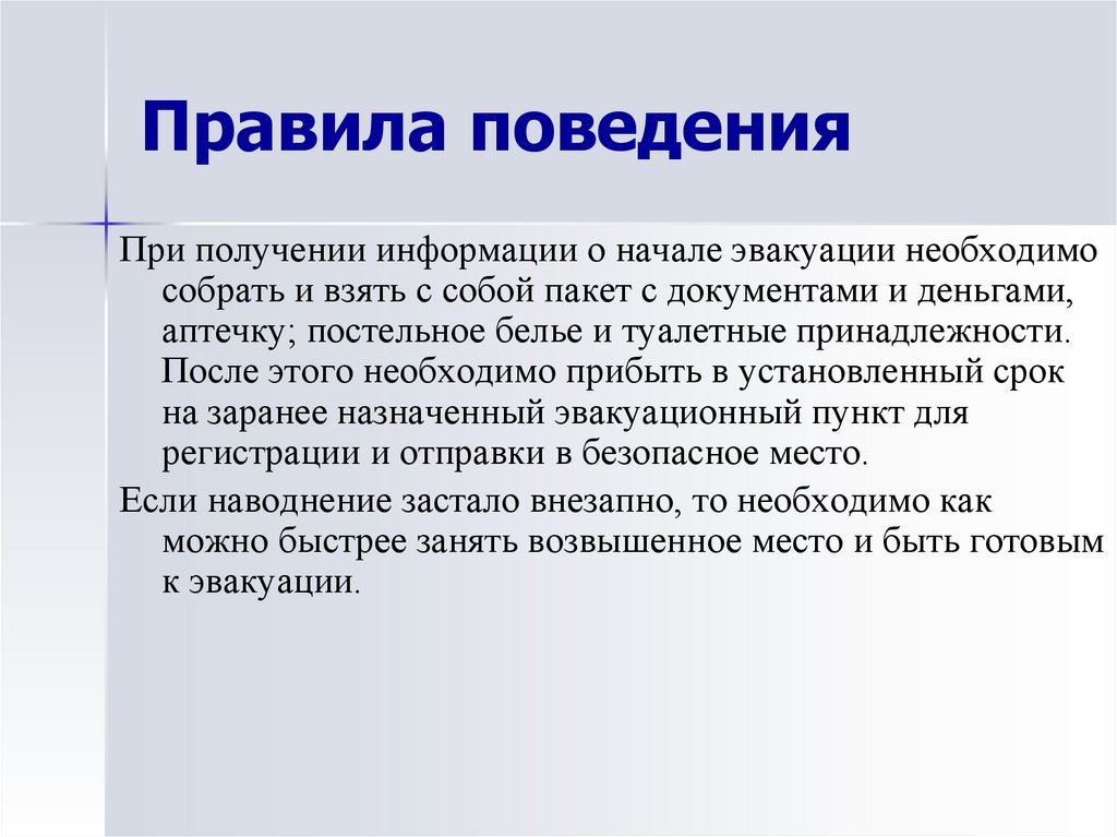 Правила поведенияПри получении информации о начале эвакуации необходимо
