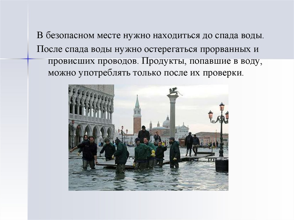 В безопасном месте нужно находиться до спада воды.После спада воды нужно остерегаться прорванных и