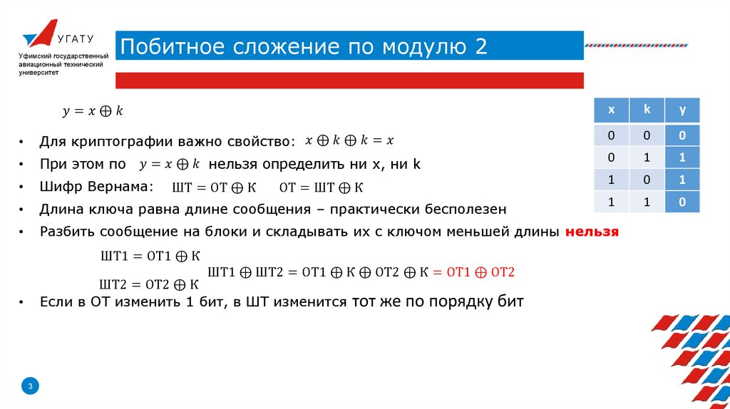 • Побитное сложение по модулю 2