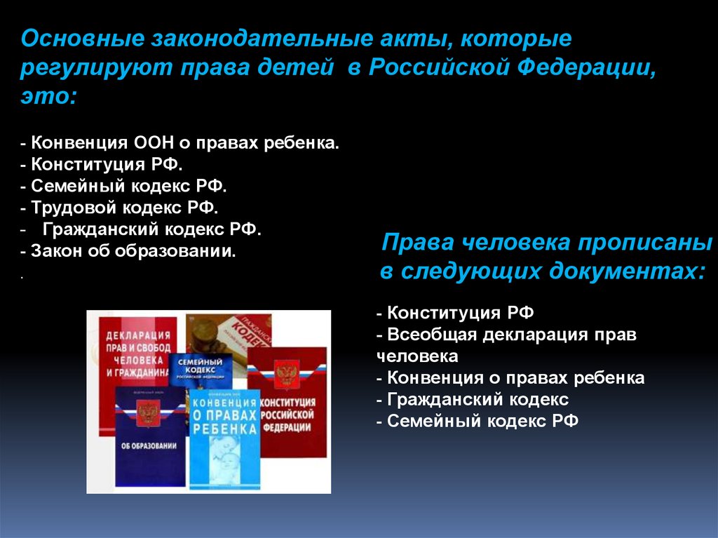 Основные законодательные акты, которыерегулируют права детей в Российской Федерации,