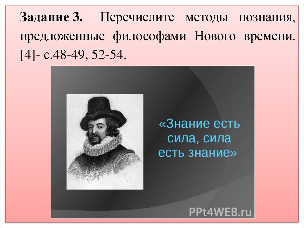 Задание 3. Перечислите методы познания,предложенные философами Нового времени.