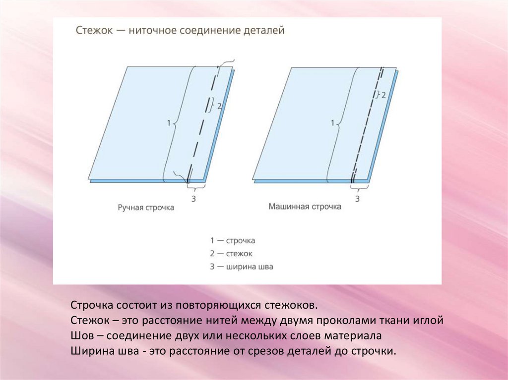 Строчка состоит из повторяющихся стежоков.Стежок – это расстояние нитей между двумя проколами ткани иглой