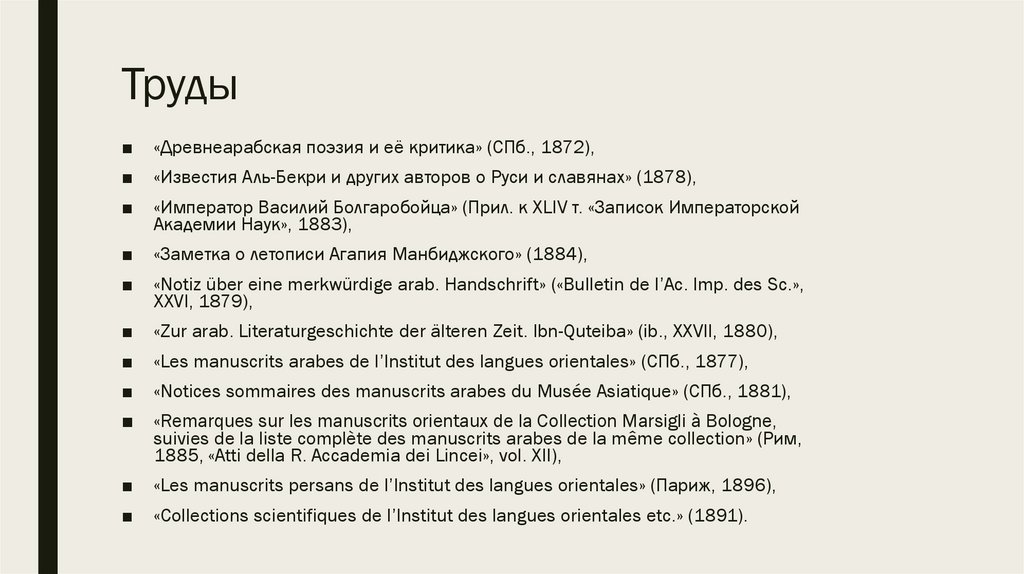 «Les manuscrits arabes de l’Institut des langues orientales» (СПб., 1877),