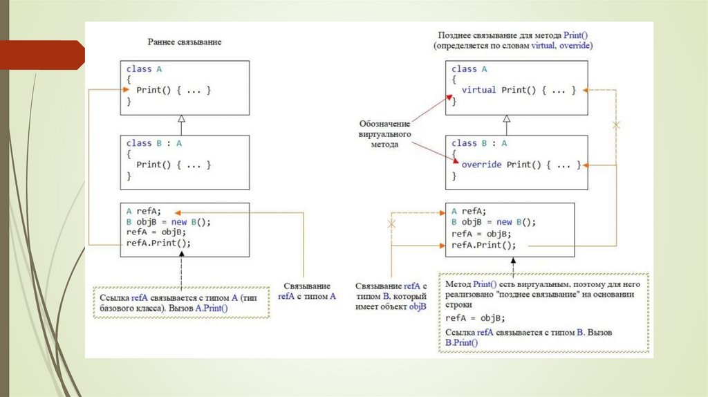 virtual, override), то компилятор строит так называемое позднее связывание. При