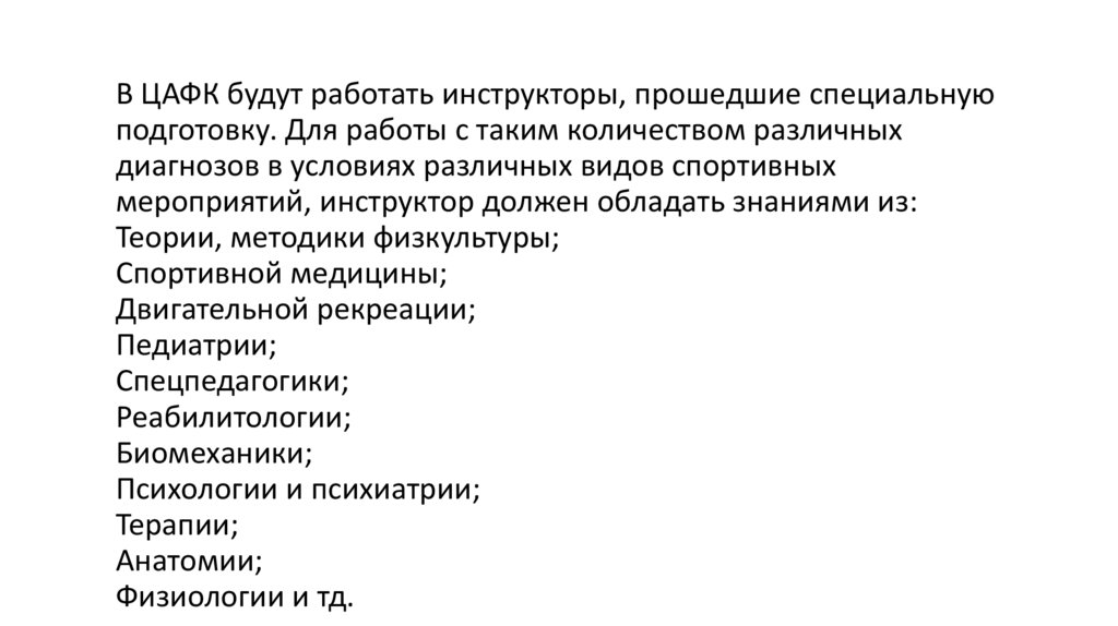 В ЦАФК будут работать инструкторы, прошедшие специальнуюподготовку. Для работы с таким количеством различных