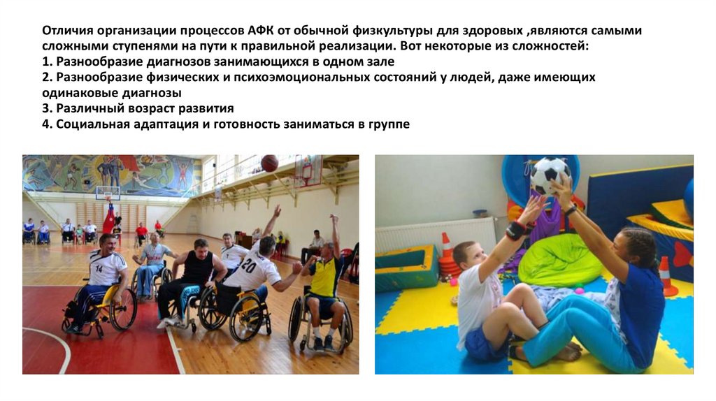 Отличия организации процессов АФК от обычной физкультуры для здоровых ,являются самымисложными ступенями на пути к правильной реализации. Вот некоторые из сложностей: