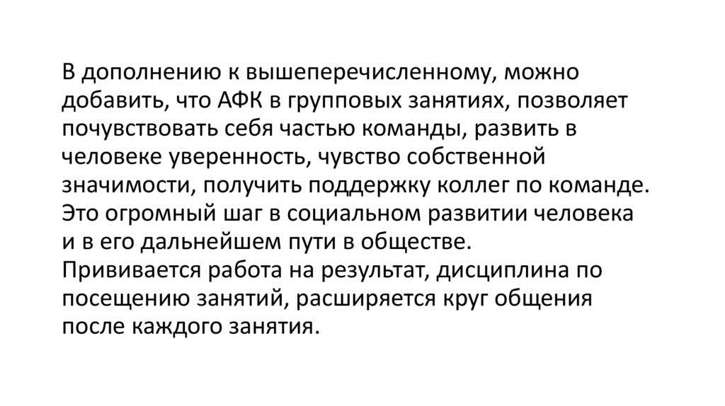 В дополнению к вышеперечисленному, можнодобавить, что АФК в групповых занятиях, позволяет