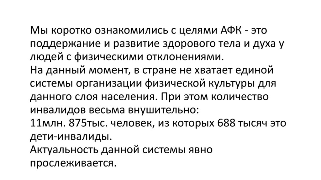 Мы коротко ознакомились с целями АФК - этоподдержание и развитие здорового тела и духа у