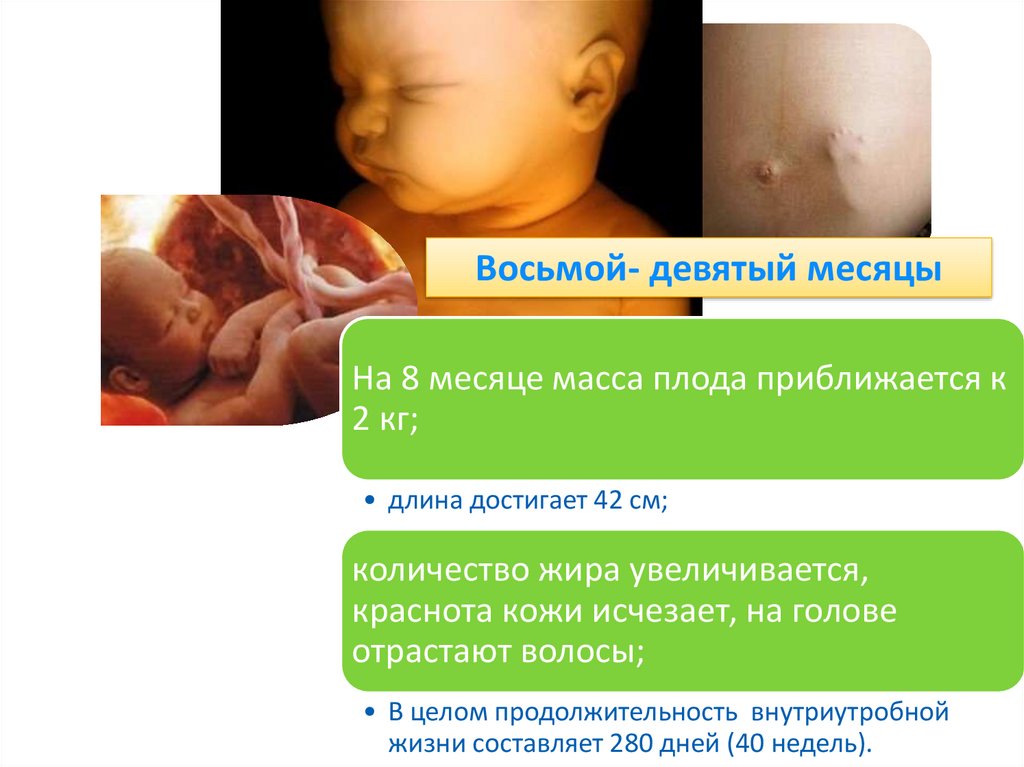 Восьмой- девятый месяцыНа 8 месяце масса плода приближается к