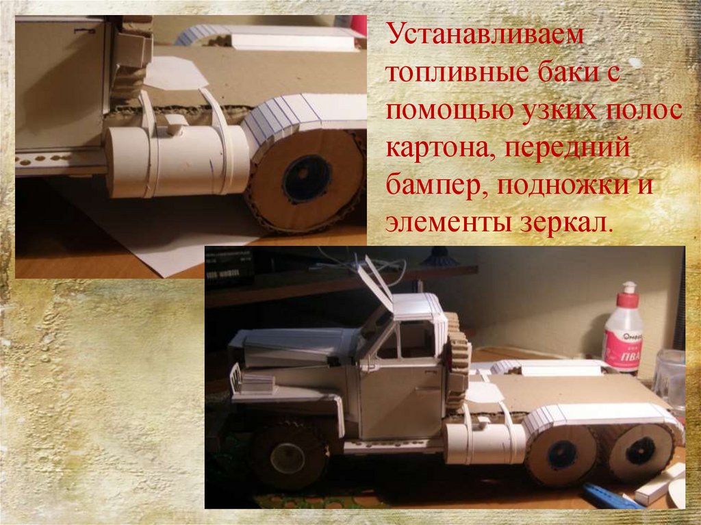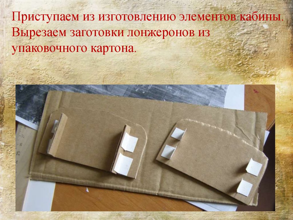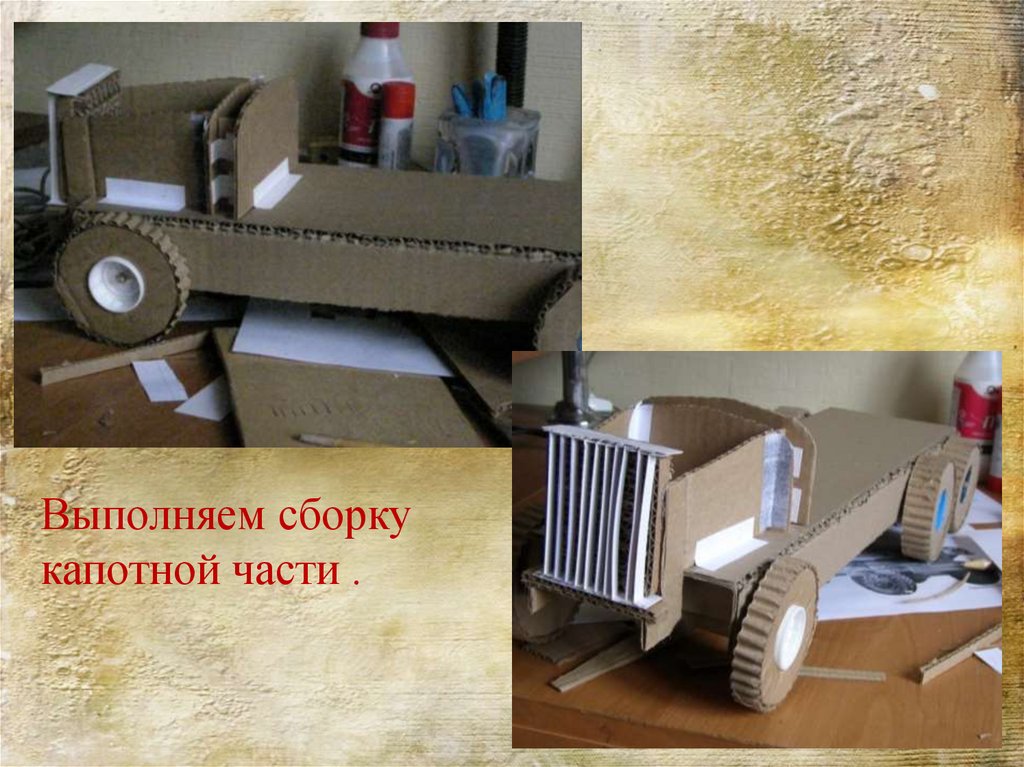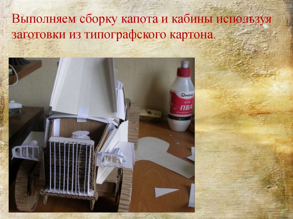 Выполняем сборку капота и кабины используязаготовки из типографского картона.